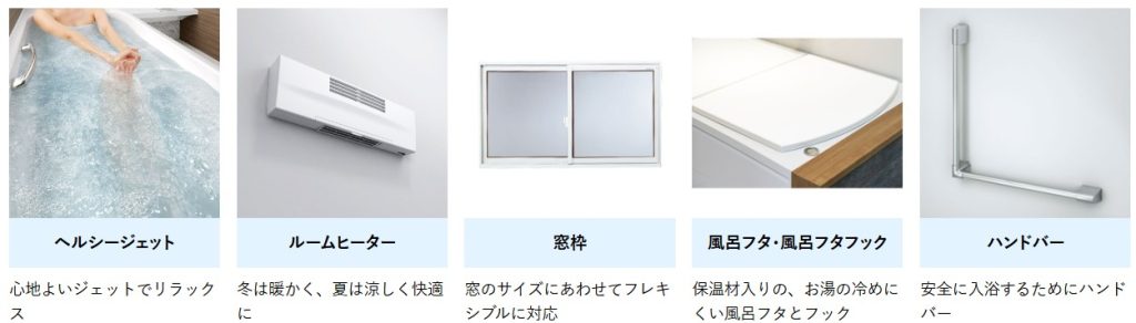 追い焚き、節水、バリアフリー機能、スマート化(タッチパネルで湯温・湯量を設定、